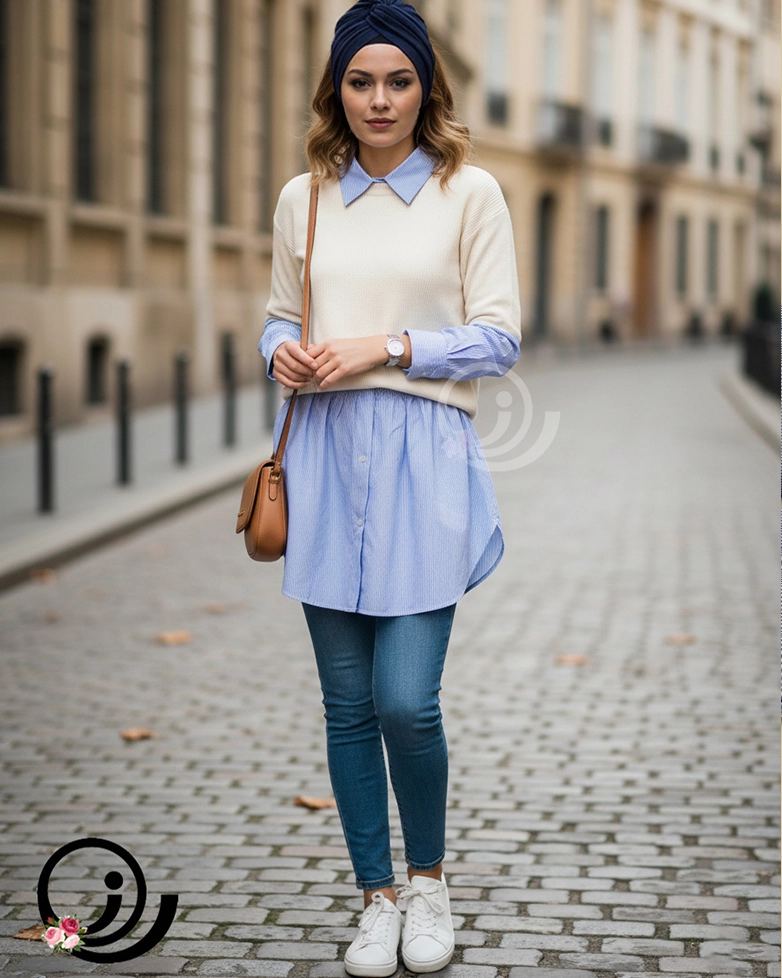ست دامنی فیک و یقه حجاب و ساقدست راه راه؛ ترکیبی از وقار، راحتی و استایل خاص
