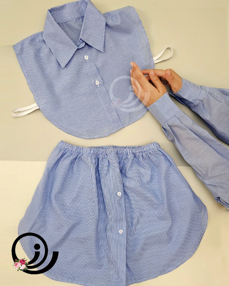 - ست کامل سهتکه: شامل دامن فیک، یقه حجاب و ساقدست راهراه