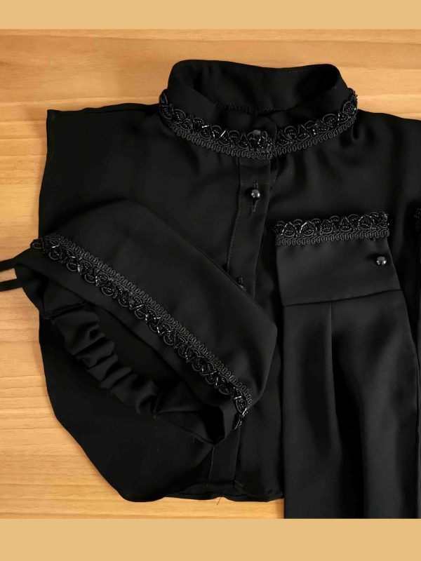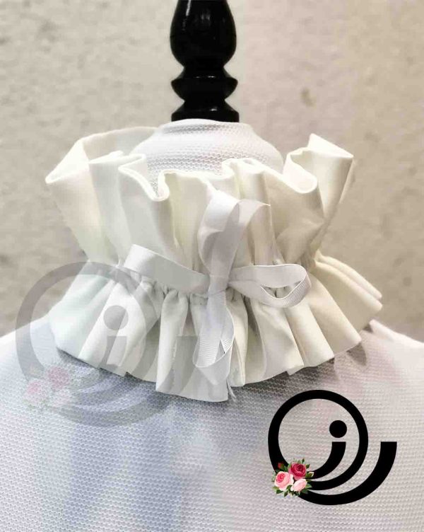 در دو طرف بدنهی یقه، کشهای ظریف و کاربردی تعبیه شده تا یقه هنگام حرکت یا پوشیدن لایههای مختلف لباس، ثابت بماند و جابهجا نشود. بخش پشتی یقه نیز کاملاً بسته و پوشیده است تا در ترکیب با کت، پالتو یا مانتو، فرم و ایستایی زیبا و منظم خود را حفظ کند.