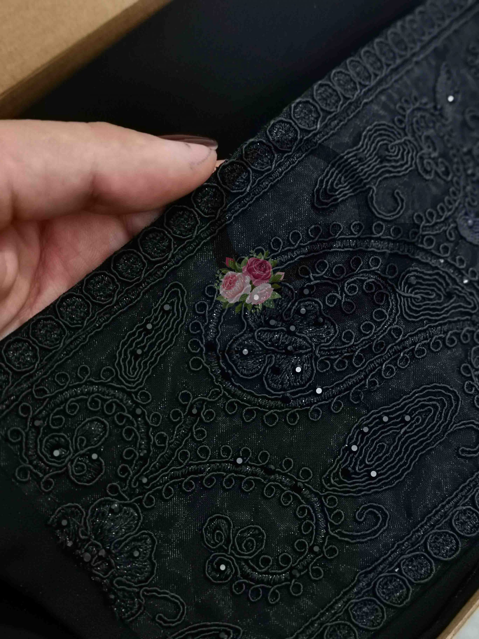 هدشال خامه دوزی نگینی رازگالری با مرغوب ترین کرپ حریر موجود در بازار تولید میشود. در اثر استفاده و شستشو گوله گوله و گره گره نمیشود و پرز نمیدهد. نگین ها کاملا ثابت هستند و ریزش ندارند.