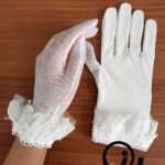 دستکش های توری سفید که با نام دستکش مجلسی نیز شناخته میشوند،بیشتر جنبه ی تزیینی دارد و بخصوص برای عروس خانم ها استفاده میشود.یکی از نکات مهم در تهیه دستکش ها سایز آن است.اگر سایز دستکس مناسب دست شما نباشد یا قابل استفاده نیست یا زیبایی کافی را ندارد. جنس این دستکش ها کشی است بنابراین روی انگشتان شما فیکس میشوند.