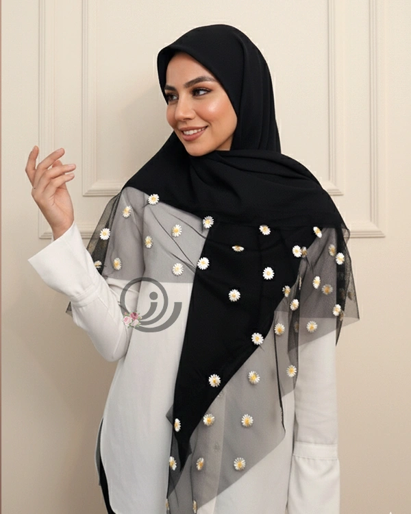 در دو ضلع روسری، تور چیندار مشکی دوخته شده که با ظرافت خاصی تزئین شده است. روی این تور، گلهای برجسته بابونه قرار گرفتهاند و جلوهای چشمنواز و زنانه به محصول دادهاند. قوارهی ۱۳۰ سانتیمتری آن نیز پوششی کامل و متناسب برای استایلهای روزمره و رسمی فراهم میکند.
