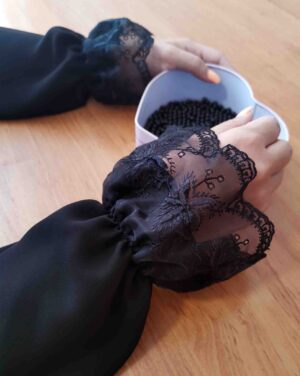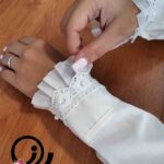 در قسمت بازوی ساق دست پرنسسی تور و مرواریدی کش قرار داده ایم.این کش ها امکان جابجایی دارند تا در صورت لزوم بدون کوچکترین دانش خیاطی بتوانید آنها تعویض کنید.لازم به ذکر است که اندازه کش ها با توجه به تجربه چندین ساله و شناخت نیاز مشتری در نظر گرفته میشود. ساق دست متناسب با سایز شما و مرغوب بوسیله ی این کش ها روی دست فیکس میشود بالا و پایین نمیرود و همچین باعث درد در ناحیه کش نمیشود.